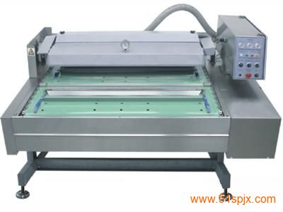 常用真空包裝機有單室與雙室二種,單室為翻板式,在上、下真空室后部有二組支架,中間有一根穿有雙扭簧的長軸,由雙扭簧平衡作用力,開啟角度45-75度不等。雙室為往復式,下真空室分為左右二個工作室,上真空室由四根連桿支撐左右位移,四根連桿固定在二根長軸上,長軸上有拉簧撥叉,二根拉伸彈簧下部定位于機架上,上部定位于拉簧撥叉上,起到平衡操作重力的作用,二根長軸由二組軸承 座定位,四根連桿上部也鑲有微型軸承,故左右位移非常輕松,真空啟動時稍加壓力,回氣結束后能自動開啟。支撐位移上真空室的四根連桿,每根長軸上的前后二根,必須保持平行,左右二組連桿也必須相對保持平行,以確保上真空室在左右任何位置均同下真空室保持平行,否則,造成上、下真空室不能保持平行,則操作壓力明顯加大,嚴重時甚至不能正常建立真空。