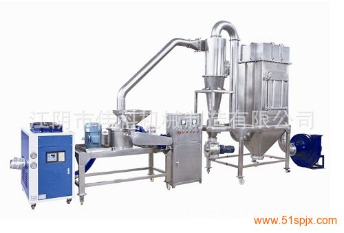 綠茶超細磨粉機經進料口螺旋送料器,將物料送入機體與導流圈之間的粉碎室,在粉碎室內被高速旋轉的刀片沖擊下,使物料甩向固定在機體上的齒圈,造成撞擊、剪切,以及物料與刀片、齒圈間的相互碰撞、摩擦、剪切進行交替粉碎。粉碎后的物料,在負壓氣流的拉力作用下,小粉粒克服自重,隨氣流越過導流圈,進入分級室。分級葉輪由葉片組成,高速旋轉的葉片產生與負壓相反的離心力,沉入葉道內的粉粒同時受到負壓氣流的向心力和粉粒自重及葉輪產生的離心力的作用,粉粒中大于臨界直徑(分級粒徑)的顆粒因質量大,被甩回粉碎室繼續粉碎,小于臨界直徑的顆粒經排粉管進入旋風收集器經排料閥排出。分級葉輪的旋轉速度越高,分級的粉粒越細,調正分級葉輪的旋轉是控制粉粒大小的決定因素。
