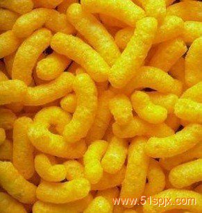 該生產線以雙螺桿膨化機為主要的設備,從原材料攪拌,水分調節,開始入手。經過高溫擠壓膨化之后,成型,熟化,并且中度膨化(原材料中的淀粉糊化)。然后經過高溫網帶式烘干箱烘烤,是原來的水分從8%左右減少為1-2%,延長了食品的自然狀態下的保質期,并且對于接下來的食品表面噴油撒涂調味料更加順利和高效。深度滋潤了油脂和調味料的食品顆粒,口感更好,更得眾多吃貨的舍命青睞。